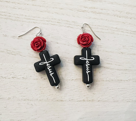 “My Jesus” rose cross earrings