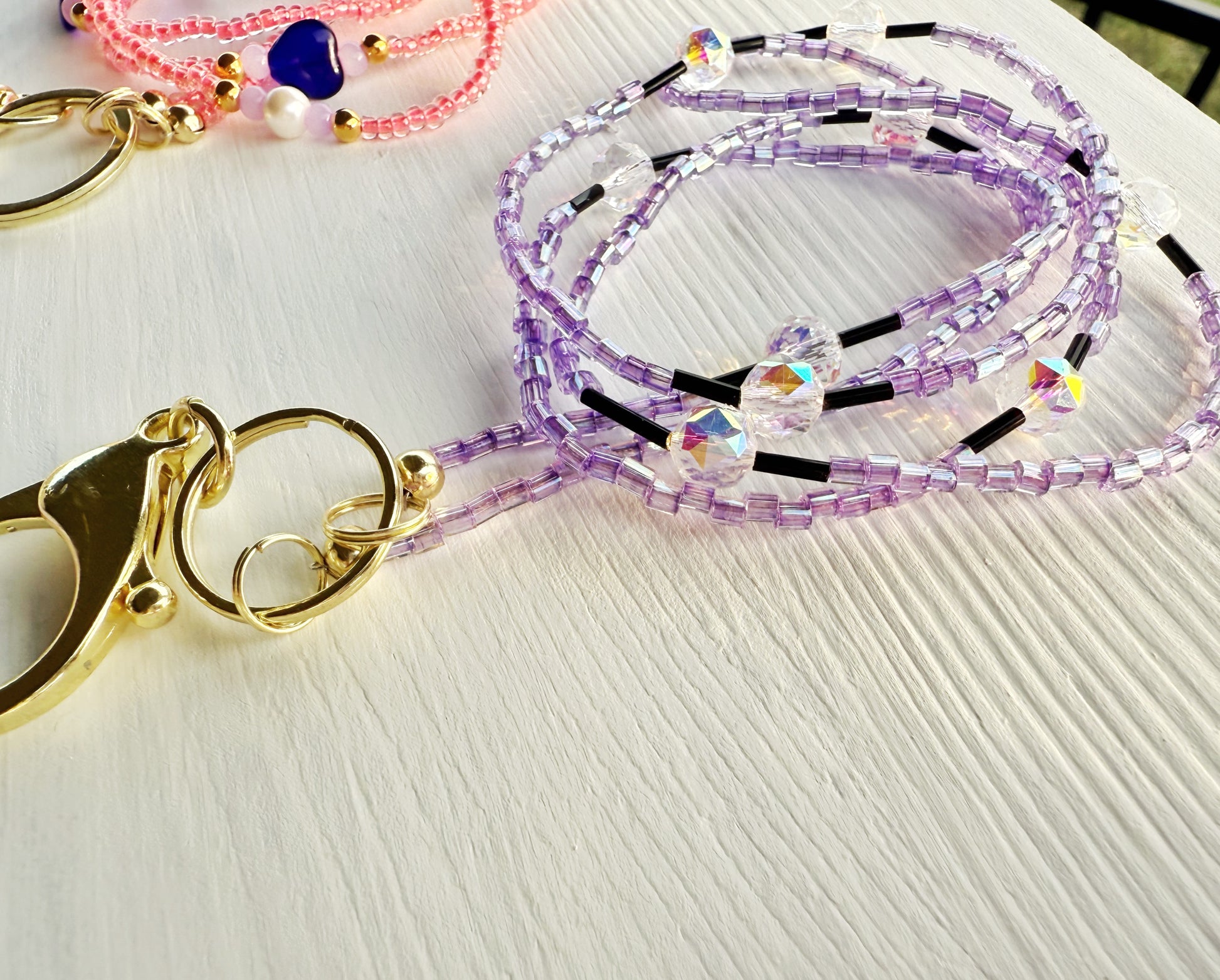 32 inch glass beaded lanyard with purple and clear and black glass iridescent beads with gold clasp