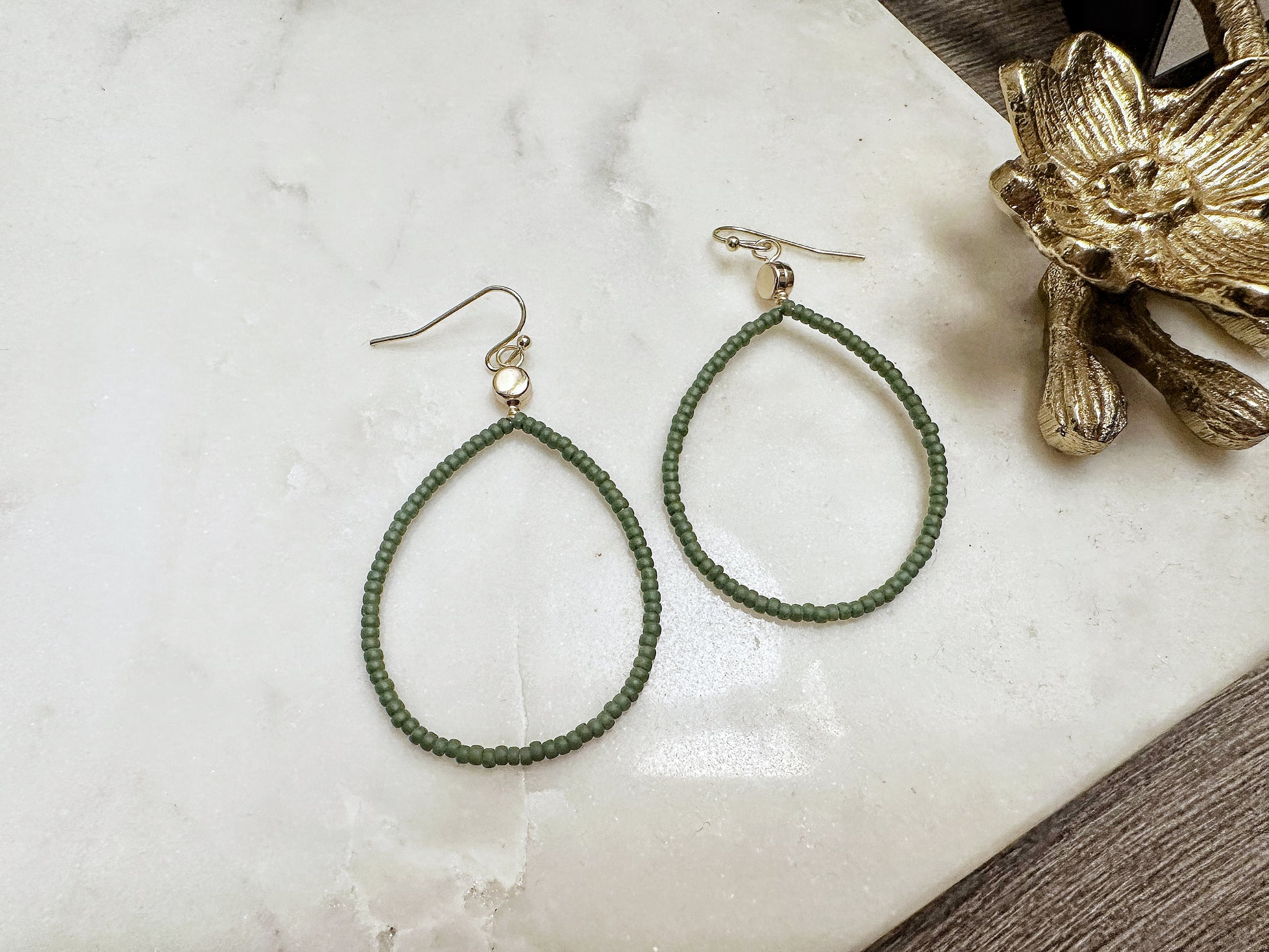 1.5 inch teardrop shaped micro beaded hoops in autumn mix seed beats. Gold round disc Bead thank you topper wire earrings. Comes in pumpkin, pink, and sage.